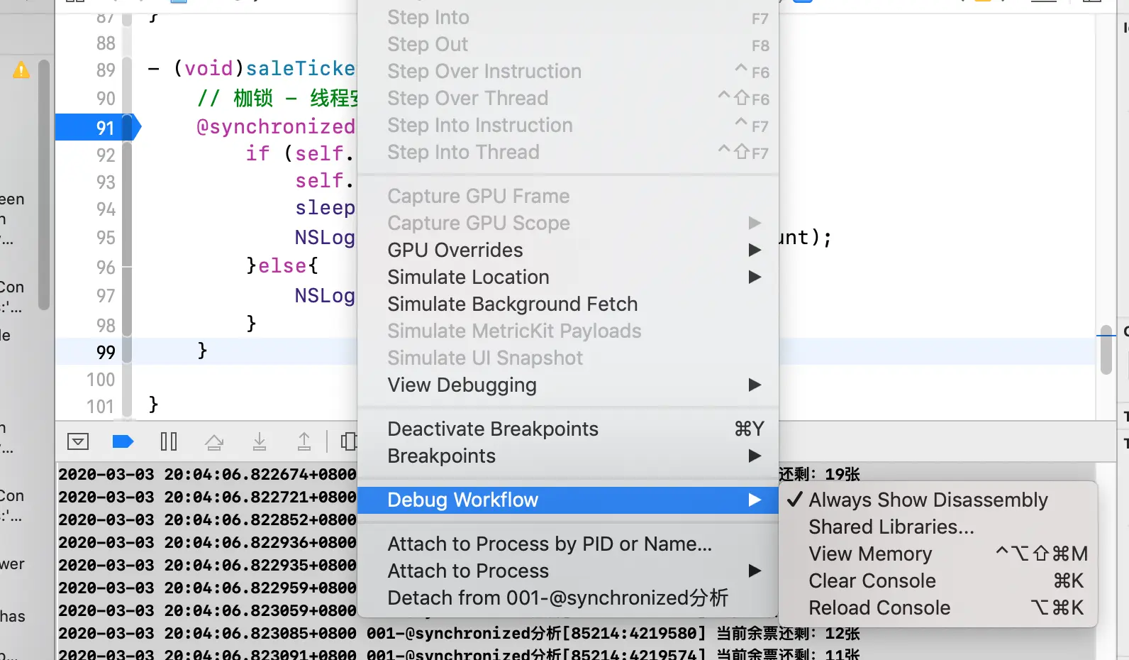 2020-03-03 20:04:06.822721+0800 001-@synchronized分析[85214:4219575] 当前余票还剩:18张