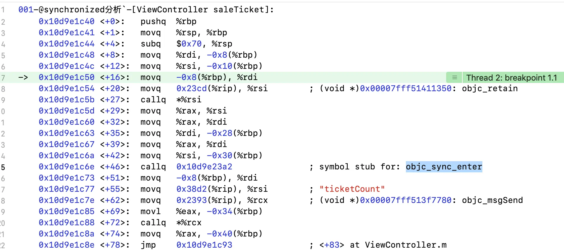 下面我们来分析下@synchronized是如何对代码进行加锁的,首先我们打开汇编,然后在@synchronized地方加一个断点: