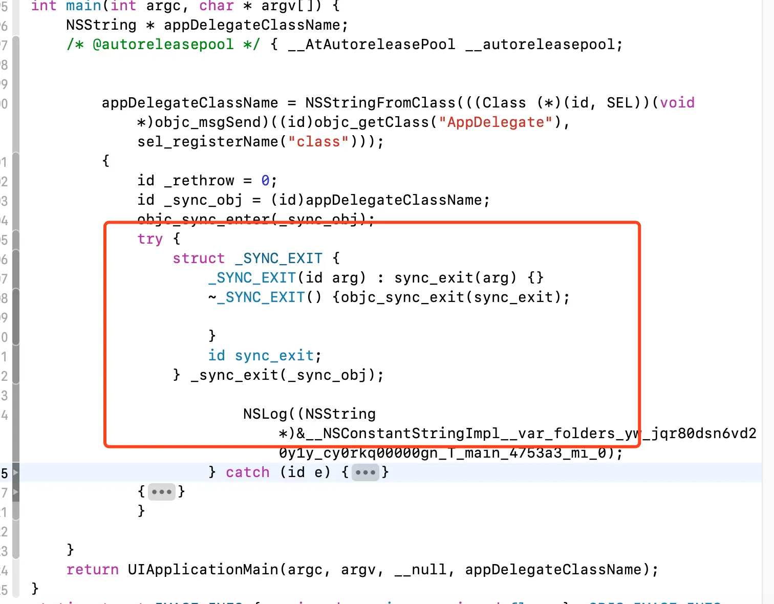 我们在main.m中添加@synchronized,然后通过clang命令将.m转成.cpp文件,