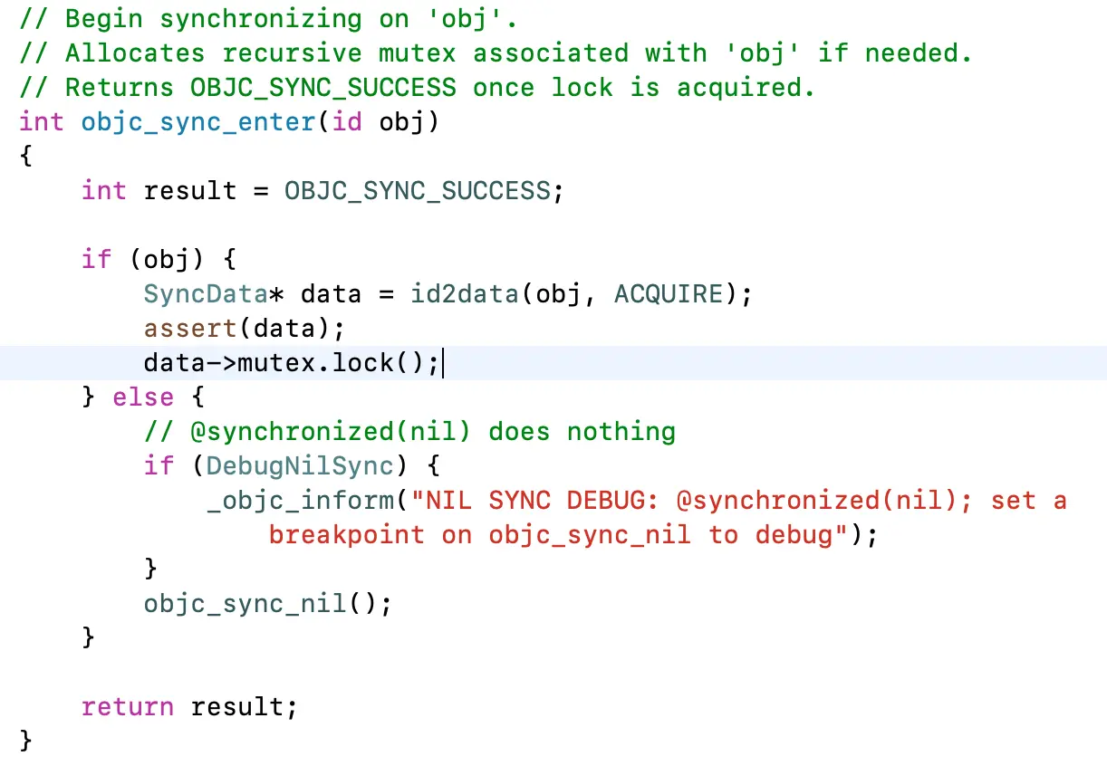 并且根据注释** @synchronized(nil) does nothing**我们知道当obj为nil的时候其实什么事情都没做,所以我们得出结论,