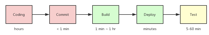 这是一个从码代码到最终部署交付的流程例子:我们花数小时码代码(Coding),不到 1 分钟提交代码(Commit),然后构建(Build)这个应用花 1 分钟到 1 小时(根据应用复杂程度),接着花数分钟部署(Deploy)这个应用,最后测试(Test)。除开代码和提交的时间,后面的构建+部署时间最少也得花几分钟,而测试可能会花更久。