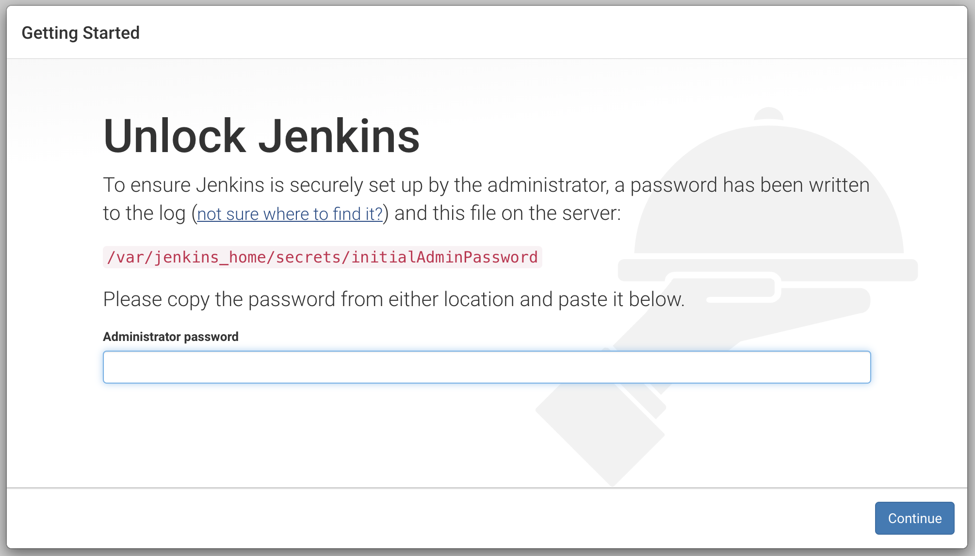 这个是告知您,需要输入初始密码,而这个密码在 Jenkins 容器里的 /var/jenkins_home/secrets/initialAdminPassword 文件里。输入以下命令来查看初始密码。