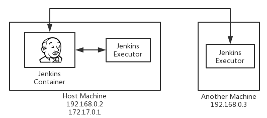 首先看下图,作者有两台物理机,IP 地址分别是 192.168.0.2 和 192.168.0.3 (假设),Jenkins 是用 Docker 起动的容器,在 192.168.0.2 这台宿主机里,而我们想在宿主机(192.168.0.2)上以及另一台物理机(192.168.0.3)上构建应用,因此需要分别需要将这两台机器注册到 Jenkins 里。