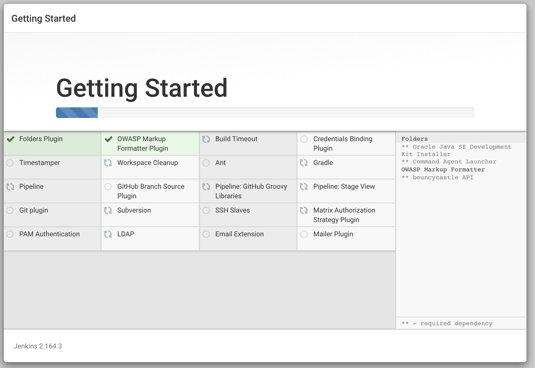 选择默认的 Install suggested plugins 安装建议的插件。然后 Jenkins 会安装一些常用的插件,例如连接 Git 的 Git plugin 、邮件插件、管道插件等等。安装进度如下图。请耐心等待,这个过程可能花很长的时间!