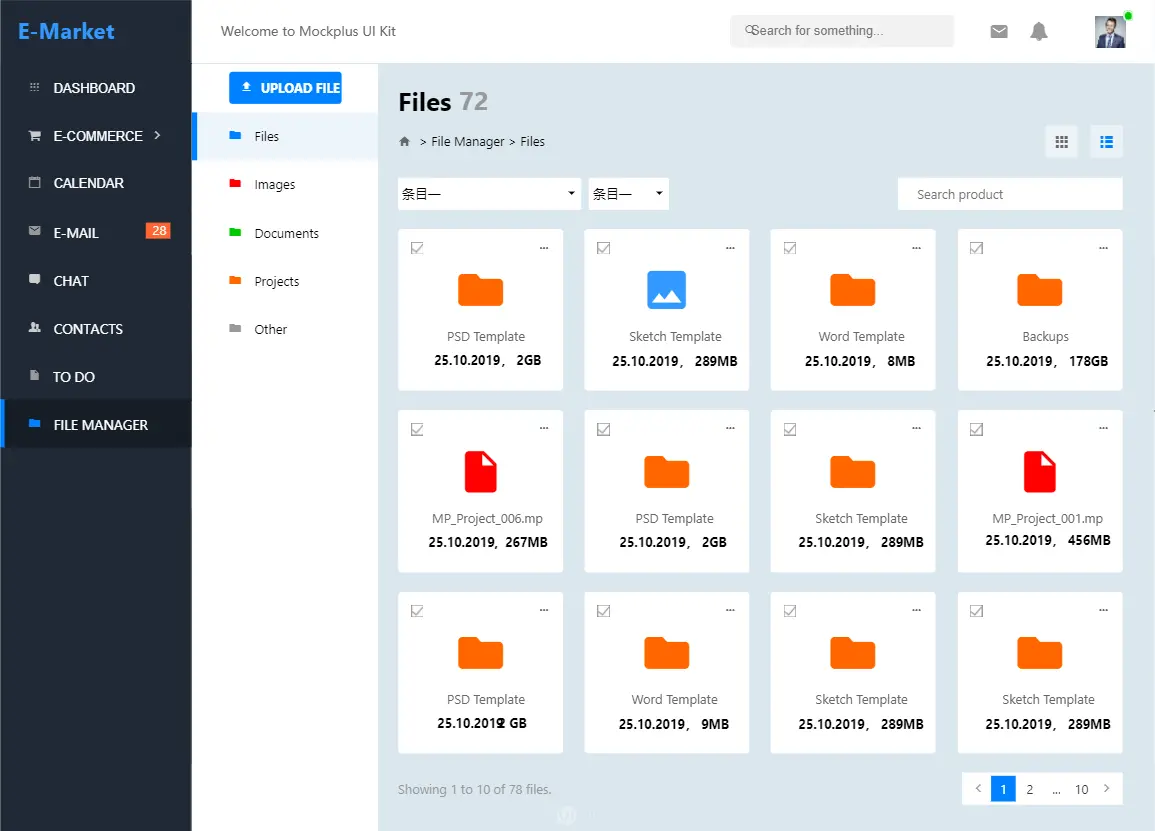 电商管理系统E-Market属于中高保真原型,包含登录注册、数据统计、信息管理、邮件、聊天、任务管理等19个重要页面,每个页面都具备必要的交互设计,较好地呈现了电管理系统的基础功能。
