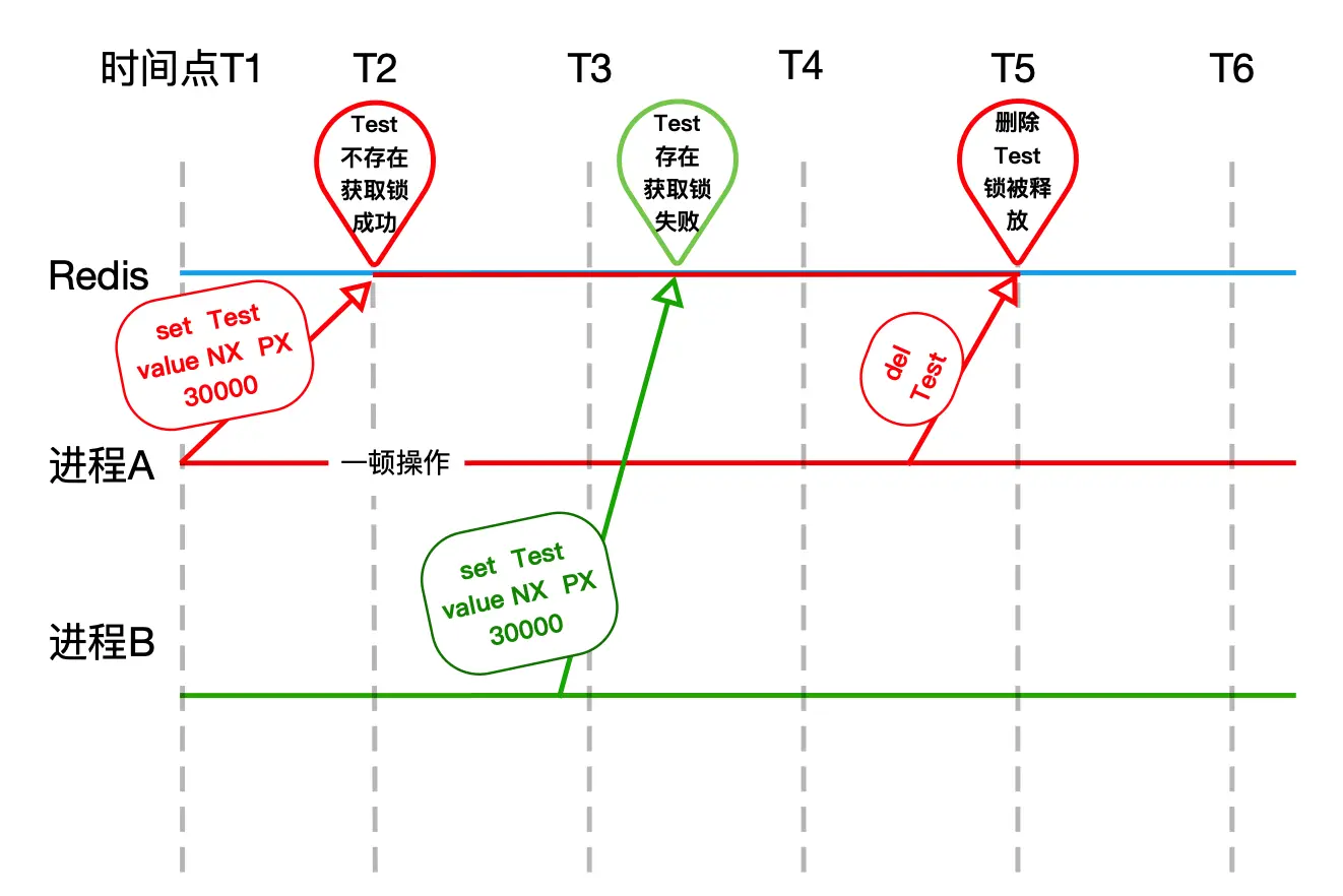 进程B在T6开开心心拿到锁不到一会,进程A操作完成,回手一个del,就把锁释放了。