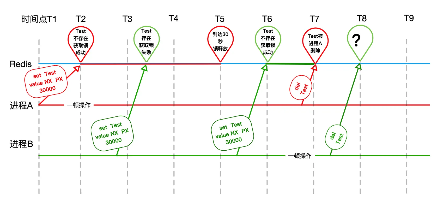 当进程B操作完成,去释放锁的时候(图中T8时刻):
