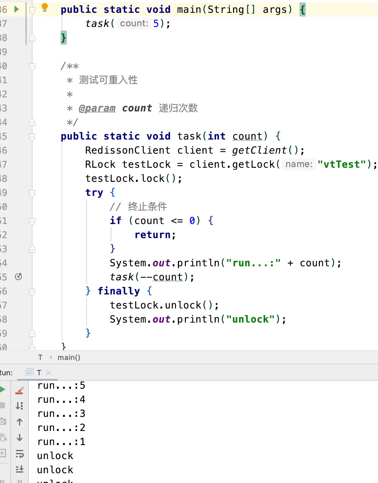 其实笔者仔细看了一下,加锁解锁的lua脚本考虑的非常全面,其中就包括锁的重入性,这点可以说是考虑非常周全,我也随手写了代码测试一下: