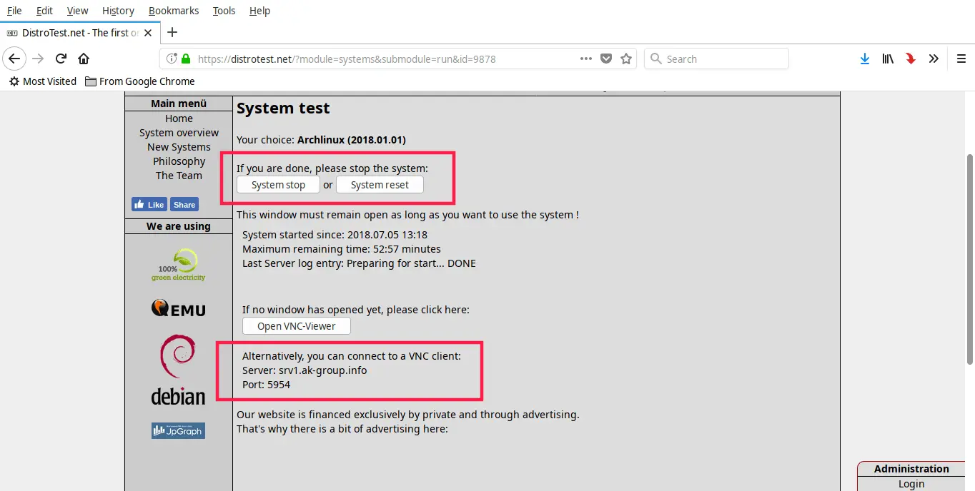 测试完之后,回到 DistroTest 页面并停止试用系统。如果不希望启用 DistroTest 页面中的弹出窗口,只需在本地安装的 VNC 客户端应用程序中,根据页面所示的连接信息连接登陆即可。