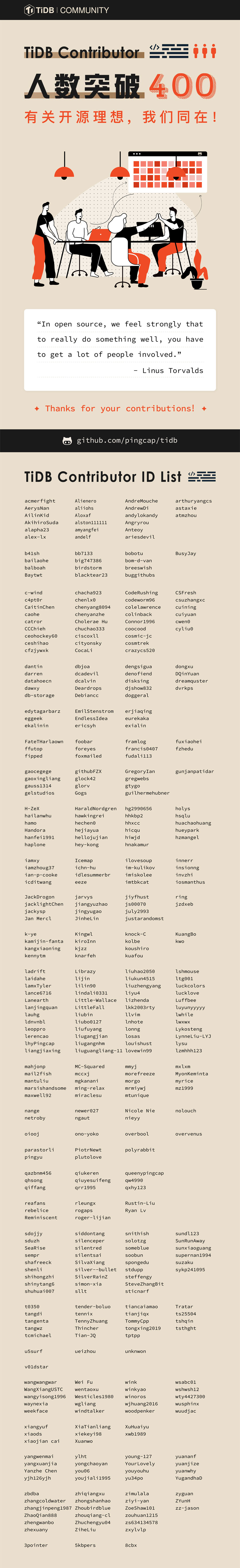 再次感谢以下 400 位 TiDB Repo Contributor 及所有社区伙伴们的贡献: