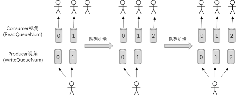 在扩容时,首先增加可读队列个数,保证 Consumer 先完成监听,再增加可写队列个数,使得 Producer 可以往新增加的队列发消息。