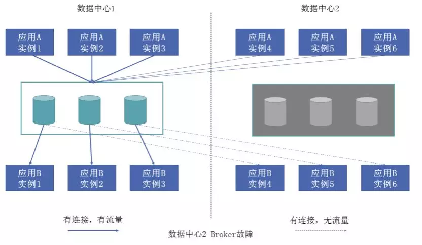 当某一个数据中心的 Broker 全部挂掉之后,请求方会跨 IDC 进行发送。如图,在数据中心 2 的 Broker 全部故障后,应用 A 的实例 4~6 会将请求发送到数据中心 1 ,根据服务就近原则,这部分请求会由数据中心 1 的应用 B 实例 1~3 处理,从而保证 Broker 故障后,经由数据中心 2 进来的请求也能被正常处理。