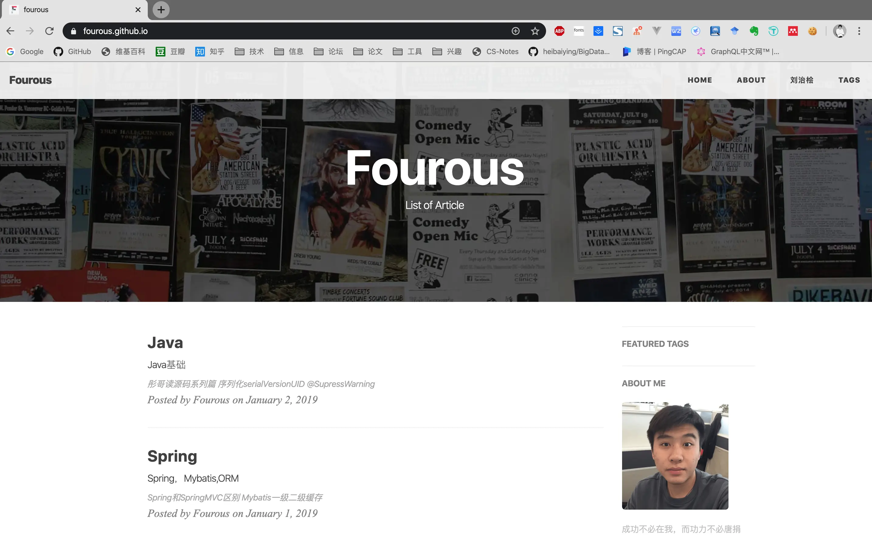 博客首页下方是文章列表,写入Markdown后用Jekyll会自动组装成HTML文件供浏览,右边是TabBar,Featured TAGS是基于Medium的Feature做的,当用的Feature Tag大于设置值,就会展示Tag在这里,下面就是个人介绍和照片。