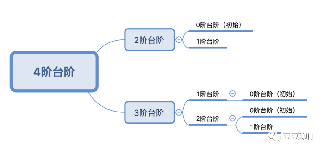 分析到这里的时候,看看这几个数据,我有一个大胆的猜测,当只有 4 阶台阶时,可以有 爬到第2阶台阶所需要的方法数 加上 爬到第3阶台阶所需要的方法数 种方法数,为什么这么说呢?你想想,要想爬到第4阶台阶,你只能是从第3阶或者第2阶台阶爬上来的,只有这两种方式对吧,所以: