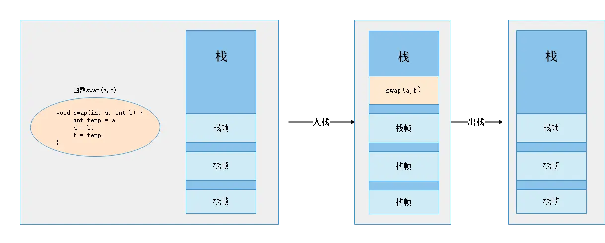 如下图所示,当虚拟机执行swap(a,b)方法时,会创建一个单独的栈帧swap(a,b)栈帧,在该栈帧中会存储于方法相关的变量,该栈帧的入栈和出栈操作对应着方法的执行和结束。