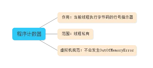 程序计数器表示当前线程所执行字节码指令的行号计数器。字节码解释器通过改变程序计数器的值,选取下一条需要执行的指令。为了保证线程切换之后恢复到正确的执行位置,每条线程都需要独立的程序计数器,所以程序计数器是线程私有的。同时程序计数器是唯一一个在虚拟机规范中没有规定OutOfMemoryError的区域。