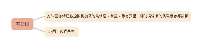 方法区存储已被虚拟机加载的类信息、常量、静态变量、即时编译后的代码缓存等数据。方法区是各个线程共享的内存区域。