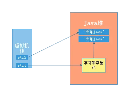 String str2 = new String("图解Java"),则会直接在Java堆中创建对象。str2指向堆中的地址。