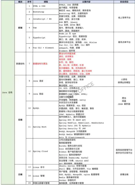 Java技术日新月异,老的技术淘汰的速度十分迅速,所以选择一个培训机构就行Java培训,学什么是十分重要的。对于课程体系,最要注意的三点,第一,技术是否前沿;第二,内容是否符合企业的要求;第三,是否涵盖实操项目。其原因在于,只会“纸上谈兵”是不能获得企业青睐的,企业需要的是一个能干活的人,只有你学的东西能和企业的最新技术相契合,能很快上手项目,有实际动手操作能力才不会让企业损失付出的酬劳。小编整理了一套完整的Java全栈课程体系,仅供大家参考。