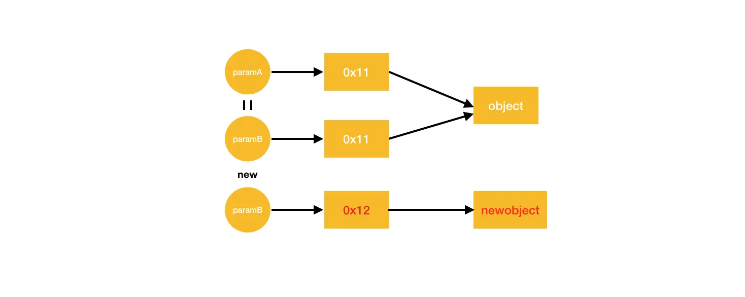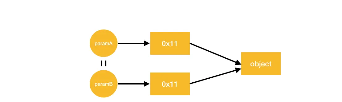 在将 paramA 的值赋给 paramB 时,和上面的基本类型其实是一样,把 paramA 中的引用创建了一个副本,所以 paramB 中存储的也是指向同一个对象的引用。所以通过 paramB 也就可以修改对象。