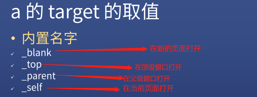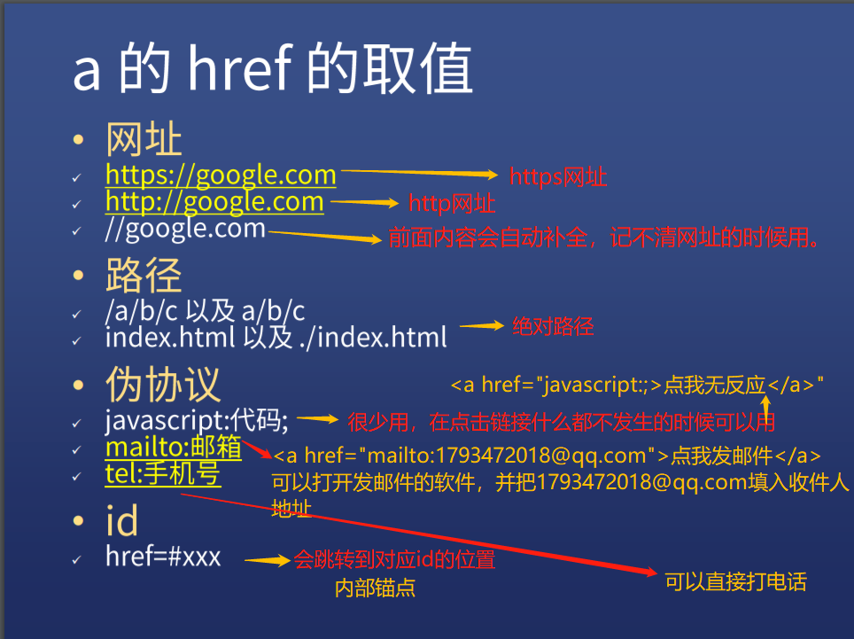 - 作用:跳转到外部页面、跳转内部锚点、跳转到邮箱或电话等