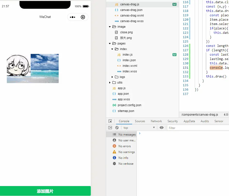 总体思路为在index中获取图片,并push进数组中,将数组传入canvas-drag组件中,由它来实现拖拽缩放等功能