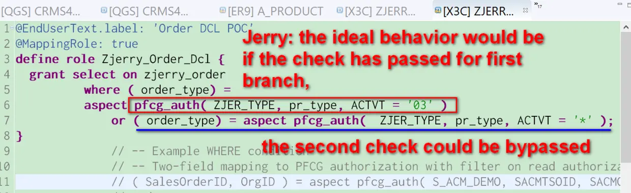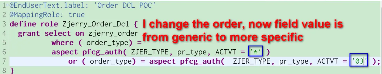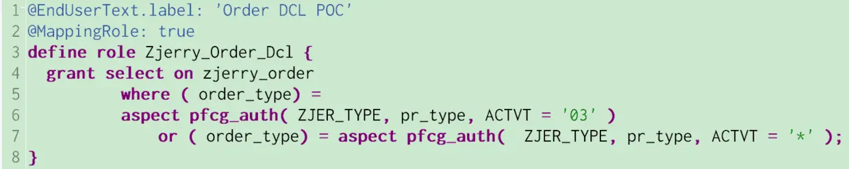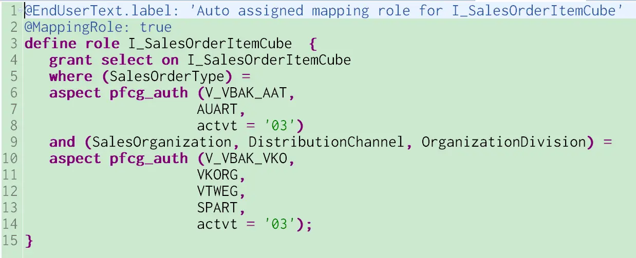 Just follow S4 DCL design. Check their package VDM_SD_ANALYTICS. Two fields in one authorization object is like intersection. Switch off: @AccessControl.authorizationCheck: #NOT_ALLOWED If a CDS entity is specified in several access rules of a CDS role or in multiple CDS roles, the resulting access conditions are joined using a logical "or".