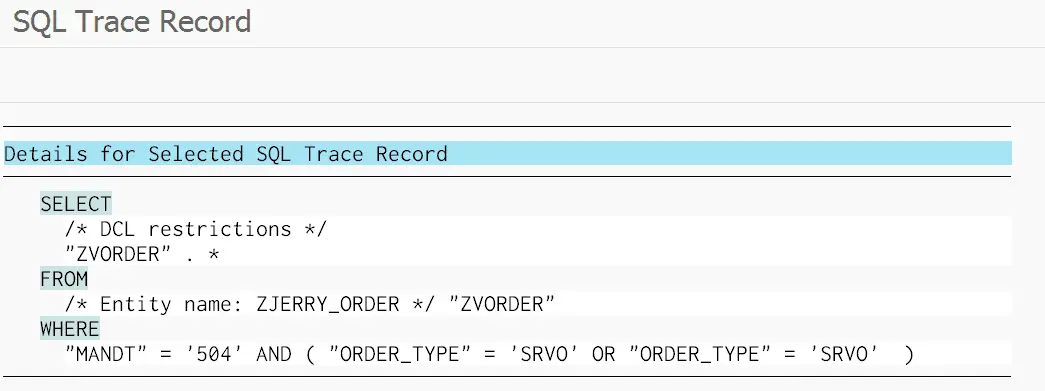 From the CDS standard training, it is IMPOSSIBLE from ABAP layer to know, whether there is indeed only 1 entry with type SRVO, or there might be more entries, but filtered out by missing authorization. When Open SQL is used to access a CDS entity and an access rule is defined in a role for this entity, the access conditions are evaluated implicitly and their selection restricted so that in SELECT reads, the access condition is added to the selection condition of the statement passed from the database interface to the database using a logical "and". This is ST05 trace: