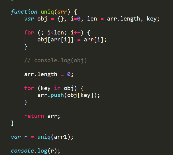 function uniq(array){ var temp = {}, r = [], len = array.length, val, type; for (var i = 0; i < len; i++) { val = array[i]; type = typeof val; if (!temp[val]) { temp[val] = [type]; r.push(val); } else if (temp[val].indexOf(type) < 0) { temp[val].push(type); r.push(val); } } return r;}