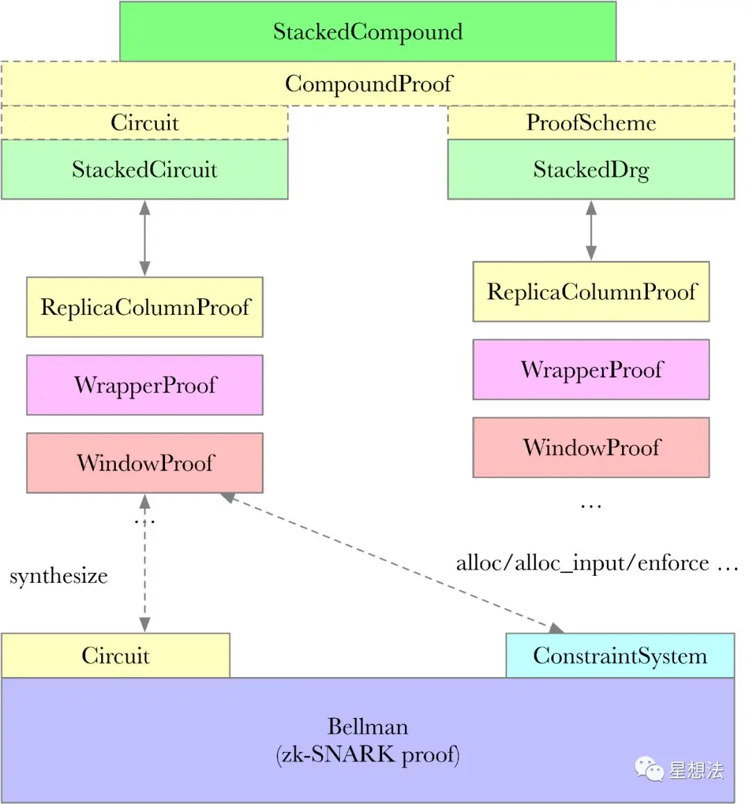 RUST-FIL-PROOF(FPS)实现了StackedCompound,专门用来实现Stacked DRG的数据处理证明。StackedCompound,将两部分整合在一起,一部分是电路(Stacked Circuit),另一部分是Stacked Drg,实现电路数据的准备。这些部分又分成一个个的子功能(Window,Wrapper,ReplicaColumn等等)。在调用Bellman生成证明时,相应电路的synthesize接口就会被调用,从而完成整个电路生成R1CS的过程。