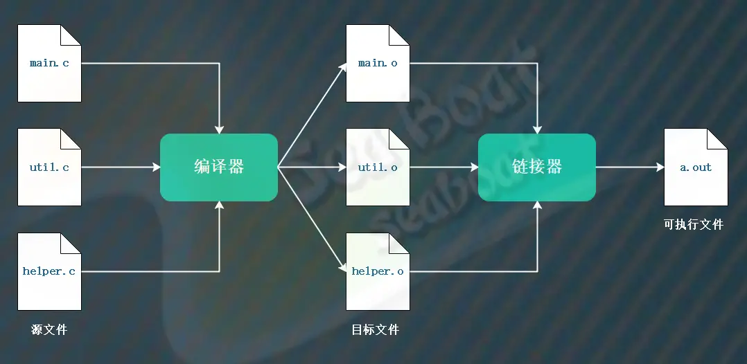 则通过如下的命令可以对多个源文件进行编译和链接,最终生成一个名为a.out的可执行文件。当我们通过./a.out执行可执行文件时,它将输出“seaboat : hello world a + b = 4”。