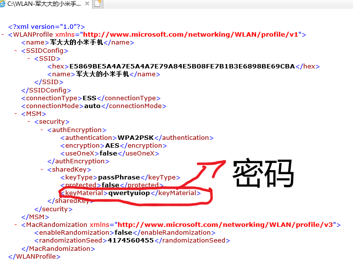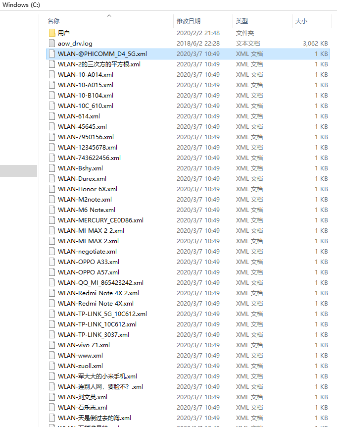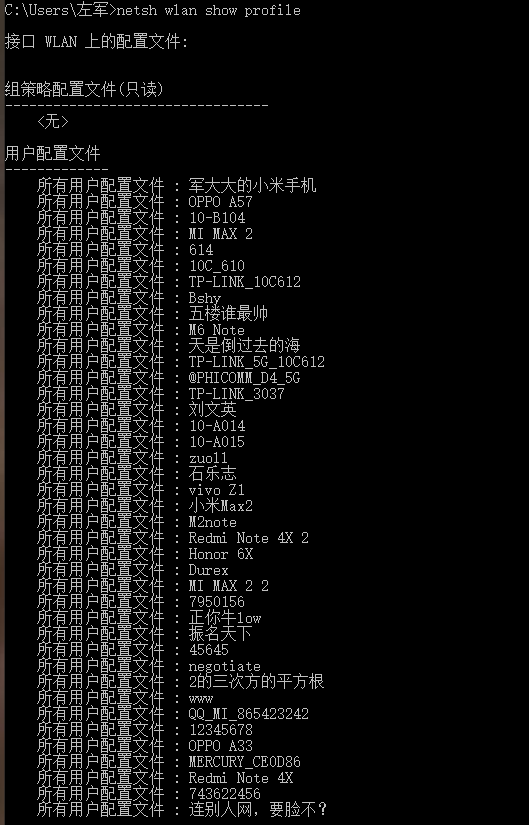 两行代码教你完美获取电脑连接的WIFI的密码(亲测有效哦) zuoZzz 2020-03-07 490 阅读1分钟 首先以管理员身份运行cmd,不知道cmd在哪的直接win(Alt左边那个)+R快捷键,再输入cmd即可。 输入第一行代码: netsh wlan show profile: 用于查找所有你的电脑连过的wifi(只要连过就有记录) 如图: 输入第二行代码: netsh wlan export profile folder=C:\ key=clear 其中: folder=C:\ 表示将wifi的信息下载到c盘(包括wifi密码); 如下图是不是觉得很神奇?: 查找你想要知道的WIFI密码