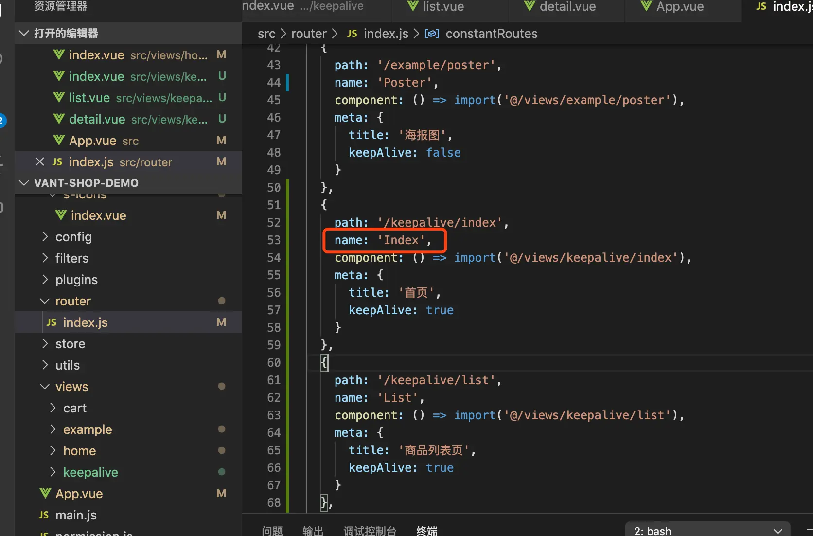 设置router添加name值和meta.keepAlive值。根据需求Index和List需要缓存设置meta.keepAlive为true,Detail为false。这里我们需要注意的是,我们除了需要在router添加name和keepAlive外,还要在对应的页面设置相同的name值,下文会有页面name设置