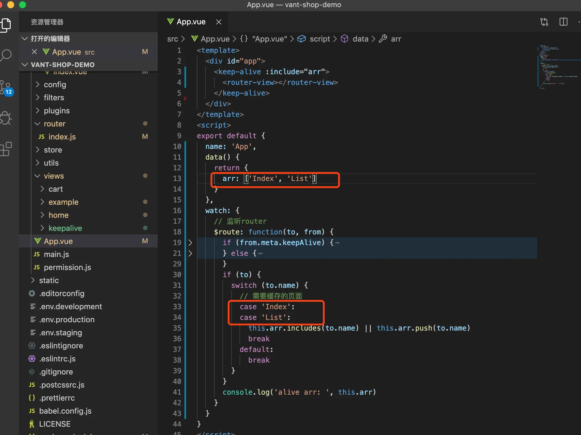 app.vue除了设置keep-alive外,还需要做的一个操作是watch $route,是动态设置是否缓存的关键,我们动态设置List页面keepAlive属性的时候,监听到router变化后,设置keep-alive的arr数组。