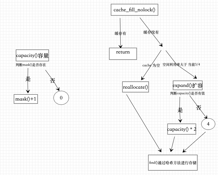 我们由上图得知_buckets发生改变的同时,_mask也会发生相应的增长.它本身的作用就是开辟当前缓存空间的大小,同时我对mask_t mask() 该函数的一个追踪在大神的指导下,整理了这么缓存一个流程图,补充:mask_t _occupied; 这个是已占用的容量大小