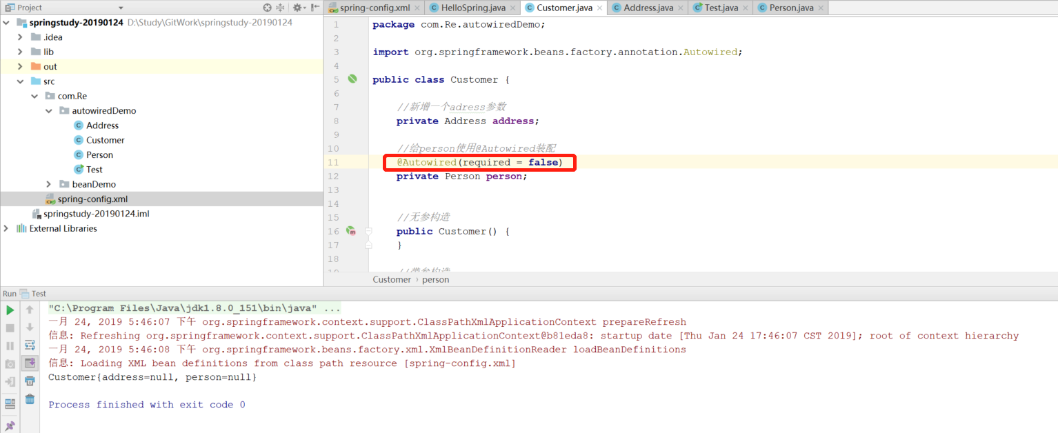 创建Customer.java,可以给属性person、带person的构造器、setPerson方法任意一个标记@Autowired