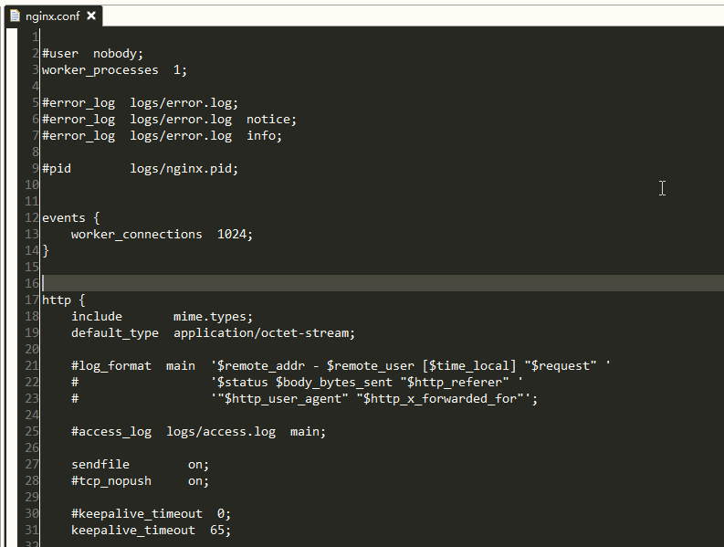 接下来我们打开conf目录下的nginx.conf文件,接下来我们所有的配置都会在这个文件下完成,如果你已经打开了,你的文件当前应该长这样