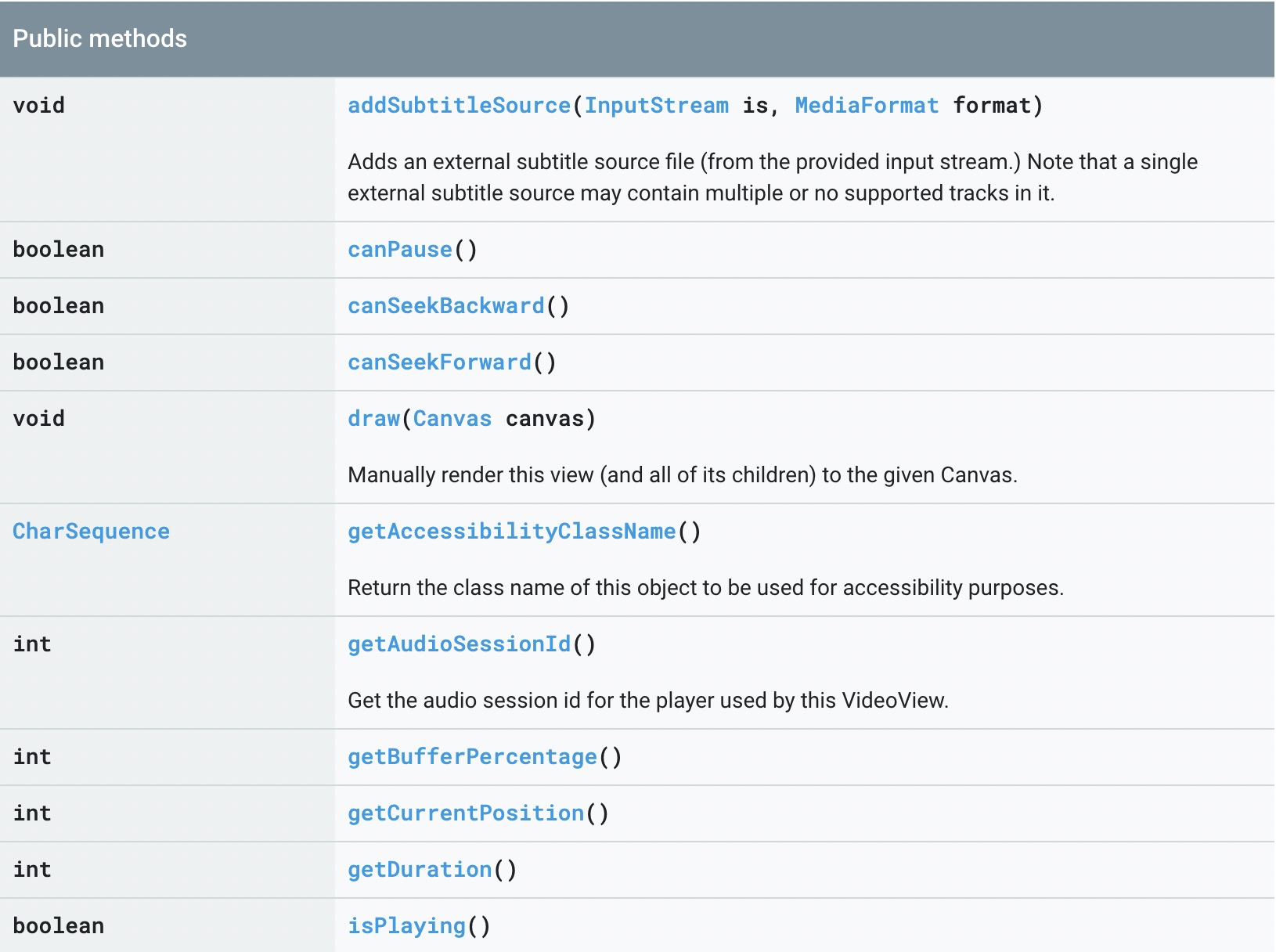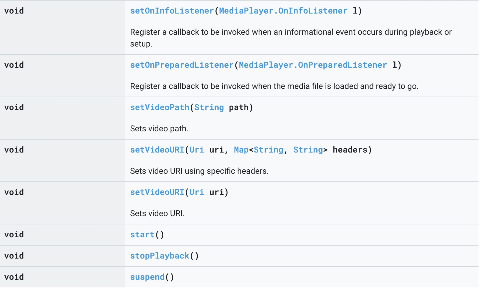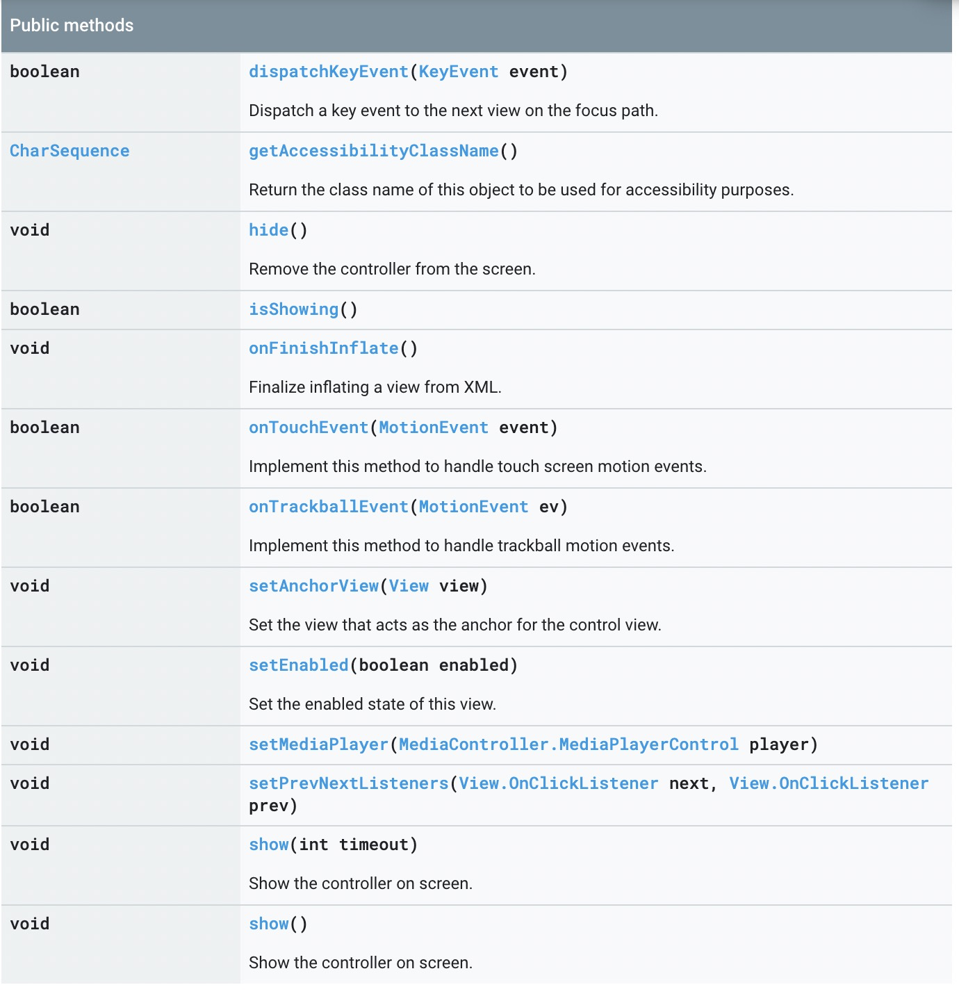 在Android上最快速的实现一个播放器的方法莫过于使用VideoView+MediaController的方式了。其中VideoView继承自SurfaceView,内部使用了MediaPlayer实现对视频的解码和渲染。看一下VideoView的方法,其中比较重要的方法就是setVideoURI,设置播放的视频源,可以是本地文件,也可以是网络文件。start/stop/suspend/pause/resume/seekTo就是主要的播放程。VideView实现了MediaController的接口,可以通过setMediaController来设置一个控制播放的MediaController控件。
