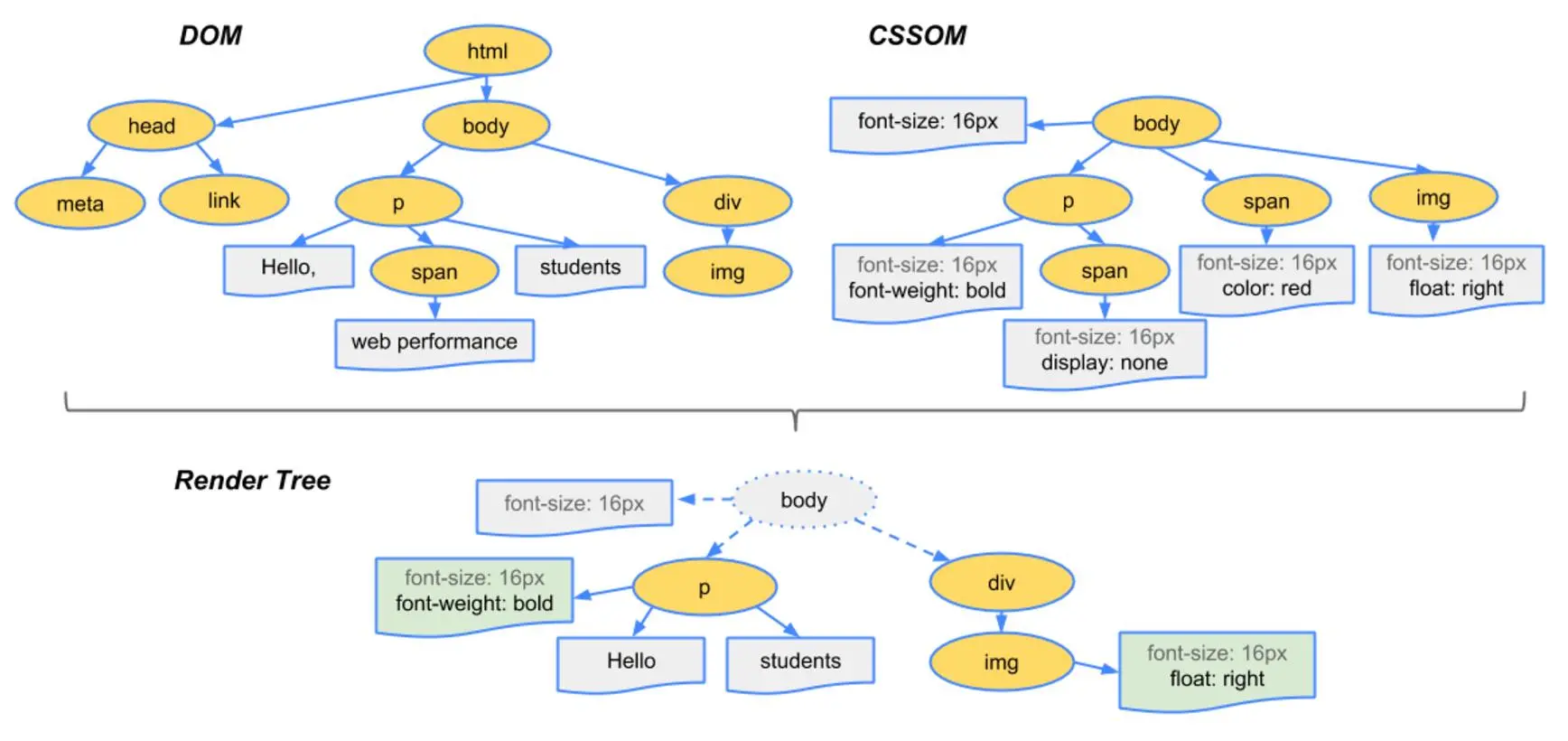 在CSSOM构建完毕之前,页面会一直处于白屏状态,这也是为什么建议将CSS引用及<style>标签放在head中,通过优先解析CSS,从而提高用户体验。