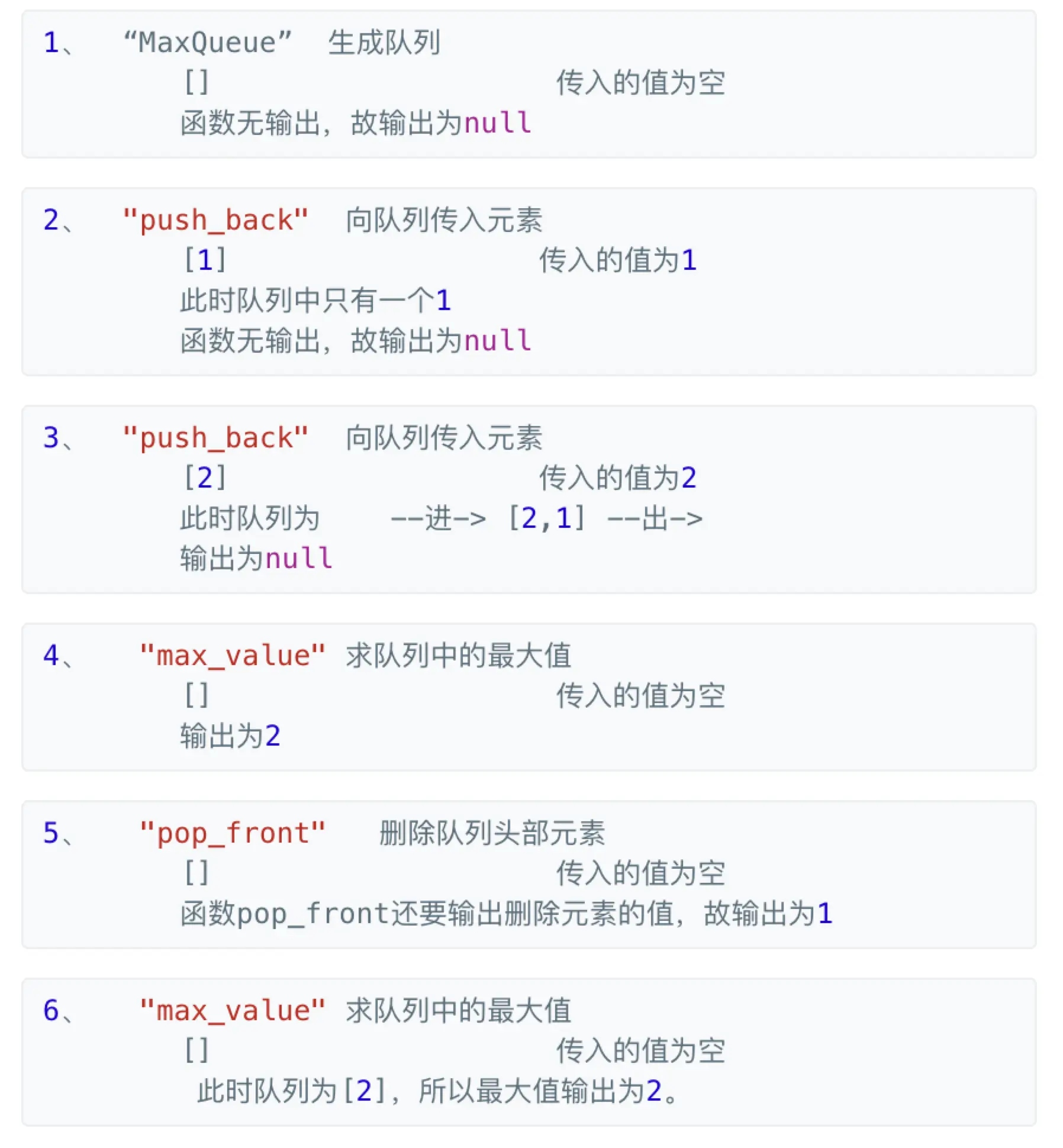 示例 1:输入: ["MaxQueue","push_back","push_back","max_value","pop_front","max_value"] [[],[1],[2],[],[],[]] 输出: [null,null,null,2,1,2]