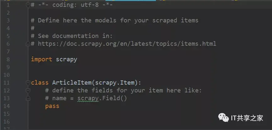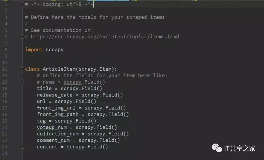 接下来我们一起来到items.py文件,去定义item,如下图所示。