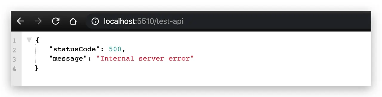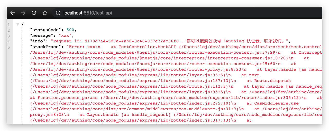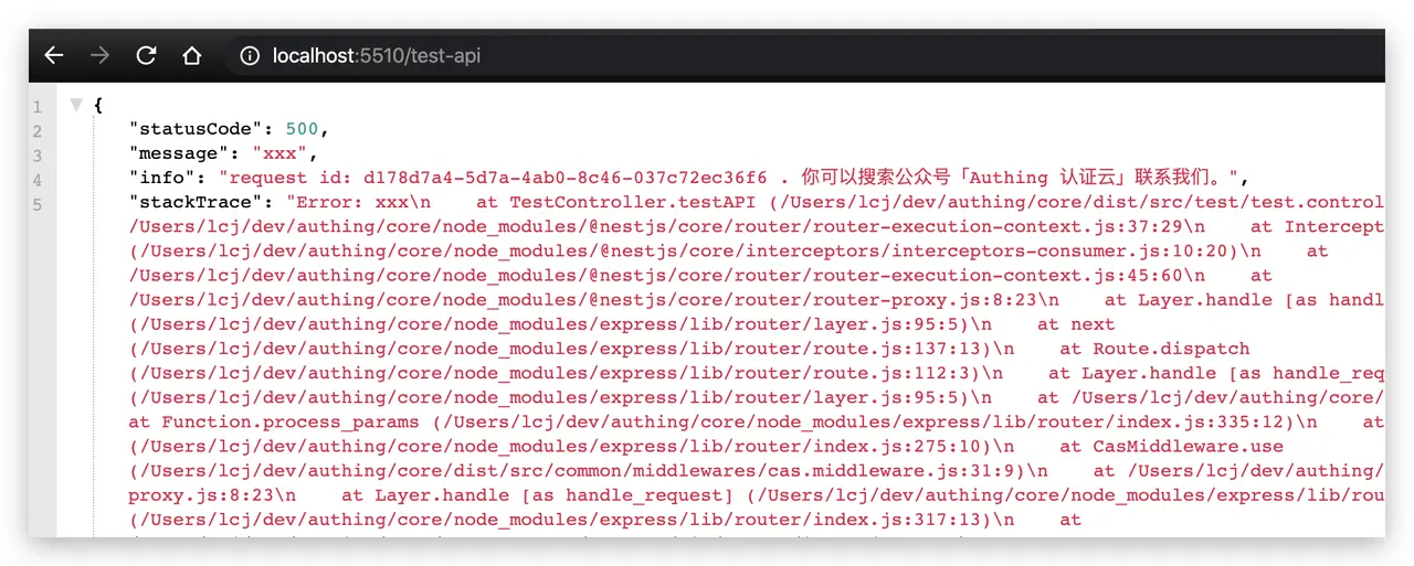 所幸 NestJS 有 Exception filters 这个 feature,运行 controller 函数中抛出的所有异常,都会走到这里。详细的说明请看官方文档,这里给个小 Demo:这个接口直接 throw Error("test"),模拟有异常没有捕获的场景: