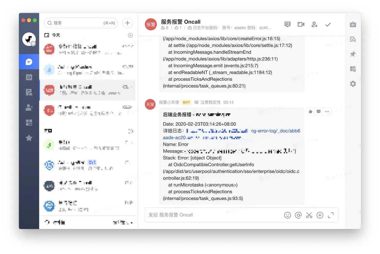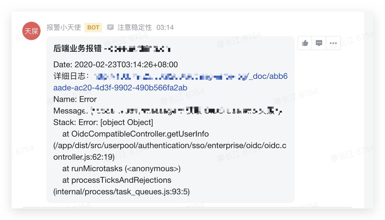 - 通知消息中包含:时间、message、stacktrack、详细日志链接