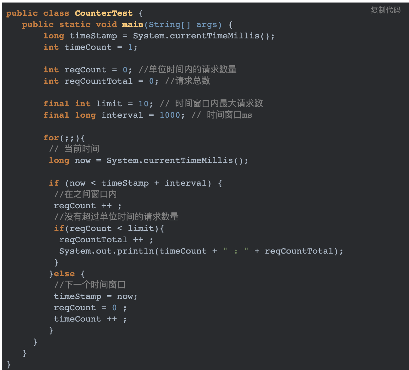 public class CounterTest { public static void main(String[] args) { long timeStamp = System.currentTimeMillis(); int timeCount = 1; int reqCount = 0; //单位时间内的请求数量 int reqCountTotal = 0; //请求总数 final int limit = 10; // 时间窗口内最大请求数 final long interval = 1000; // 时间窗口ms for(;;){ // 当前时间 long now = System.currentTimeMillis(); if (now < timeStamp + interval) { //在之间窗口内 reqCount ++ ; //没有超过单位时间的请求数量 if(reqCount < limit){ reqCountTotal ++ ; System.out.println(timeCount + " : " + reqCountTotal); } }else { //下一个时间窗口 timeStamp = now; reqCount = 0 ; timeCount ++ ; } } }}复制代码滑动窗口算法