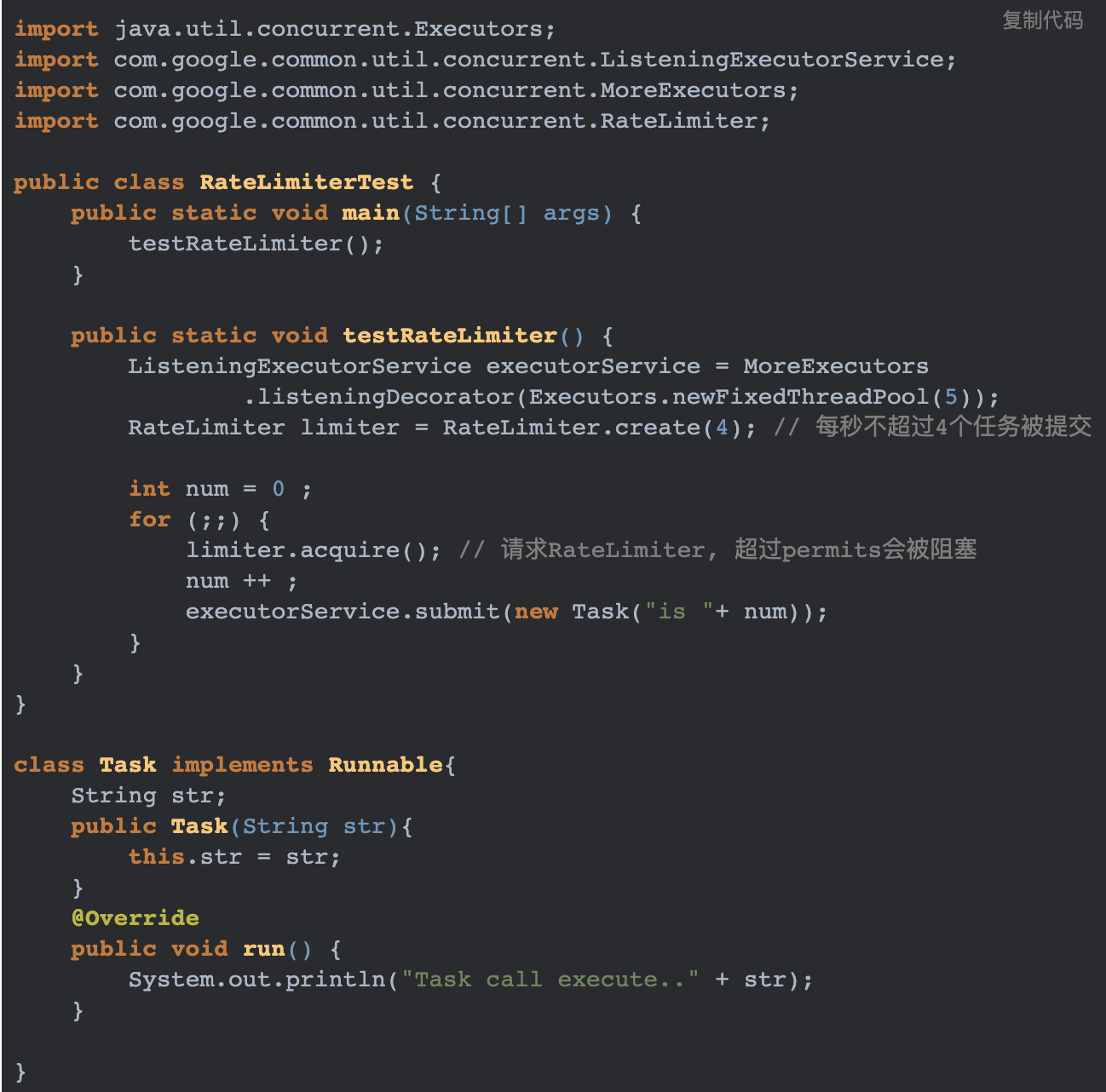 import java.util.concurrent.Executors;import com.google.common.util.concurrent.ListeningExecutorService;import com.google.common.util.concurrent.MoreExecutors;import com.google.common.util.concurrent.RateLimiter;public class RateLimiterTest { public static void main(String[] args) { testRateLimiter(); } public static void testRateLimiter() { ListeningExecutorService executorService = MoreExecutors .listeningDecorator(Executors.newFixedThreadPool(5)); RateLimiter limiter = RateLimiter.create(4); // 每秒不超过4个任务被提交 int num = 0 ; for (;;) { limiter.acquire(); // 请求RateLimiter, 超过permits会被阻塞 num ++ ; executorService.submit(new Task("is "+ num)); } }}class Task implements Runnable{ String str; public Task(String str){ this.str = str; } @Override public void run() { System.out.println("Task call execute.." + str); }}