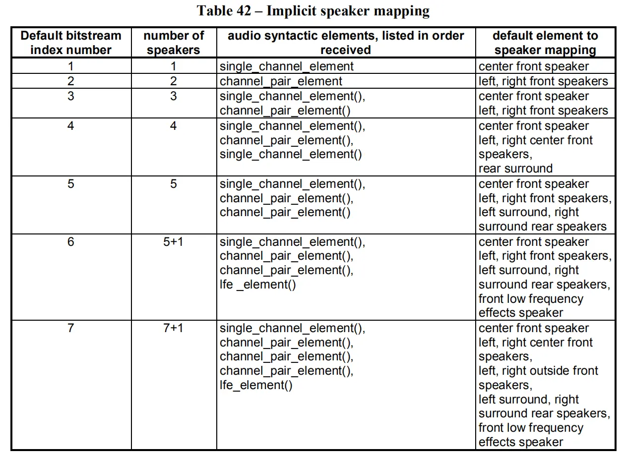 channel_configuration:3bit,声道配置. 如果等于0,则声道配置在第一个raw_data_block中通过调用program_config_element设置;如果大于0,则参照下图