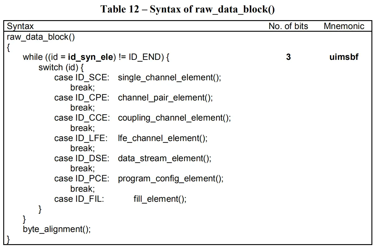 后面就是元素内容的具体分析了,由于涉及到音频编码的知识,比较复杂,这里不做讨论。