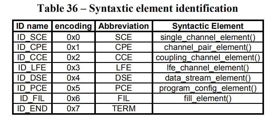 FIL: Fill Element,填充元素。包含了一些扩展信息。如SBR,动态范围控制信息等。