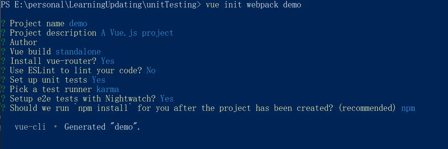 选择命令set up unit tests(Y/n) Y -----------------------此命令是安装单元测试命令