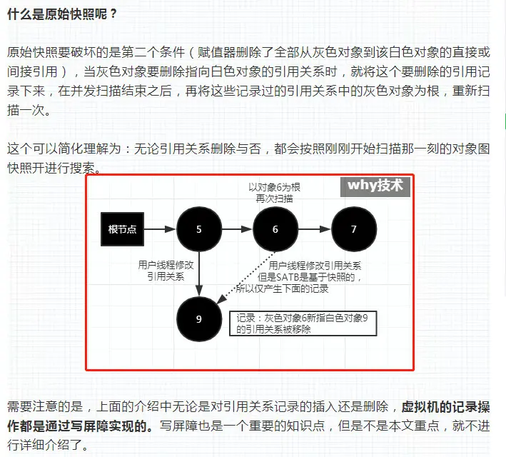 因为删除操作会触发 pre-write barrier,把每次引用关系变化时旧的引用值记下来,只有这样,等 GC 线程到达某一个对象时,这个对象的所有引用类型字段的变化全都有记录在案,就不会漏掉任何在快照图里活的对象。当然,很可能有对象在快照中是活的,但随着并发 GC 的进行它可能本来已经死了,但 SATB 还是会让它活过这次 GC,变成了浮动垃圾。